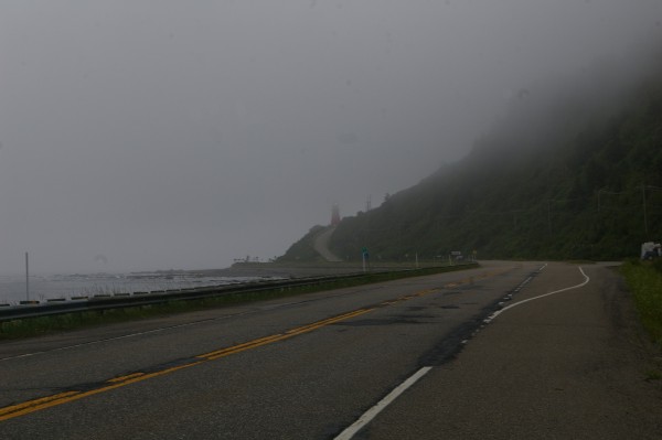 Just as soon as I left Forillon Park, I not only experienced the ever-present fog, but I also was RAINED on badly! I only stoped in the town of Gaspe to get some gas. |