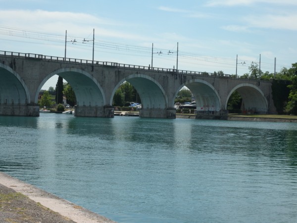 A high speed railway bridge crossing the river. Note the wires that power the trains above the tracks.
