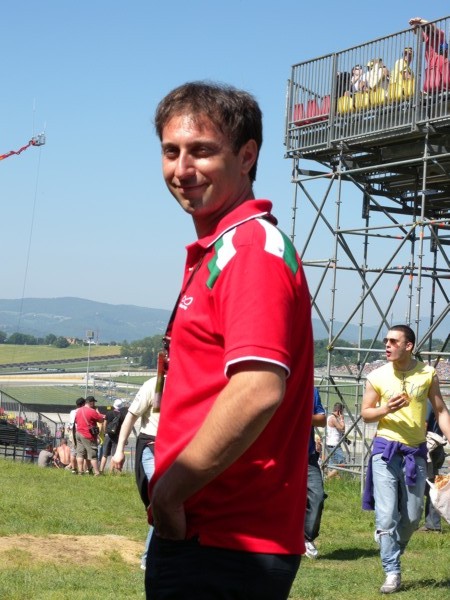 Once the races began, I was glued to my seat. Sitting in front of me were the self-named "Austrian Bastards", led by Manuel (brown t-shirt). Manuel was a very funny and interesting fellow. Upon learning of my Italian tour, he told me how he had travelled all of Europe on his 50 cc scooter. He told me he'd send me a photo of that scooter via email so I could link to it on this page, but unfortunately he never did. |