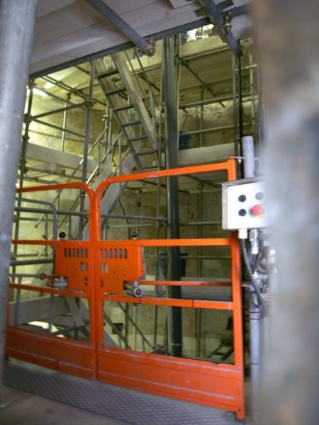 On the way down, I peeked through an opening to see the interior of the tower. As you can see, there is an aluminum stairway leading up around a central pole which obviously adds stability to the tower. |